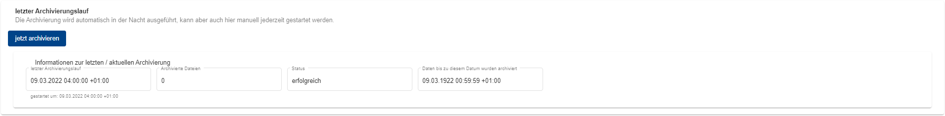 Per Klick auf den Button “Jetzt archivieren” kann eine manuelle Archivierung im Hintergrund angestoßen werden.