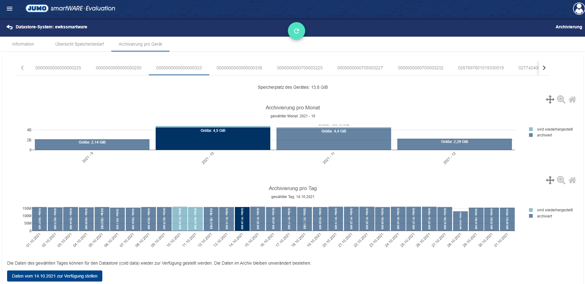Archivdaten des Monats im unteren Bereich pro Tag aufgelistet. Mit dem unteren Button "Daten vom ... zur Verfügung stellen" können Archivdaten des ausgewählten Tages im Datastore wieder als Cold Data zur Verfügung gestellt werden. Die Wiederherstellung findet im Hintergrund statt. Während die Daten eines Tages wiederhergestellt werden, kann die Wiederherstellung weiterer Tage gestartet werden.
