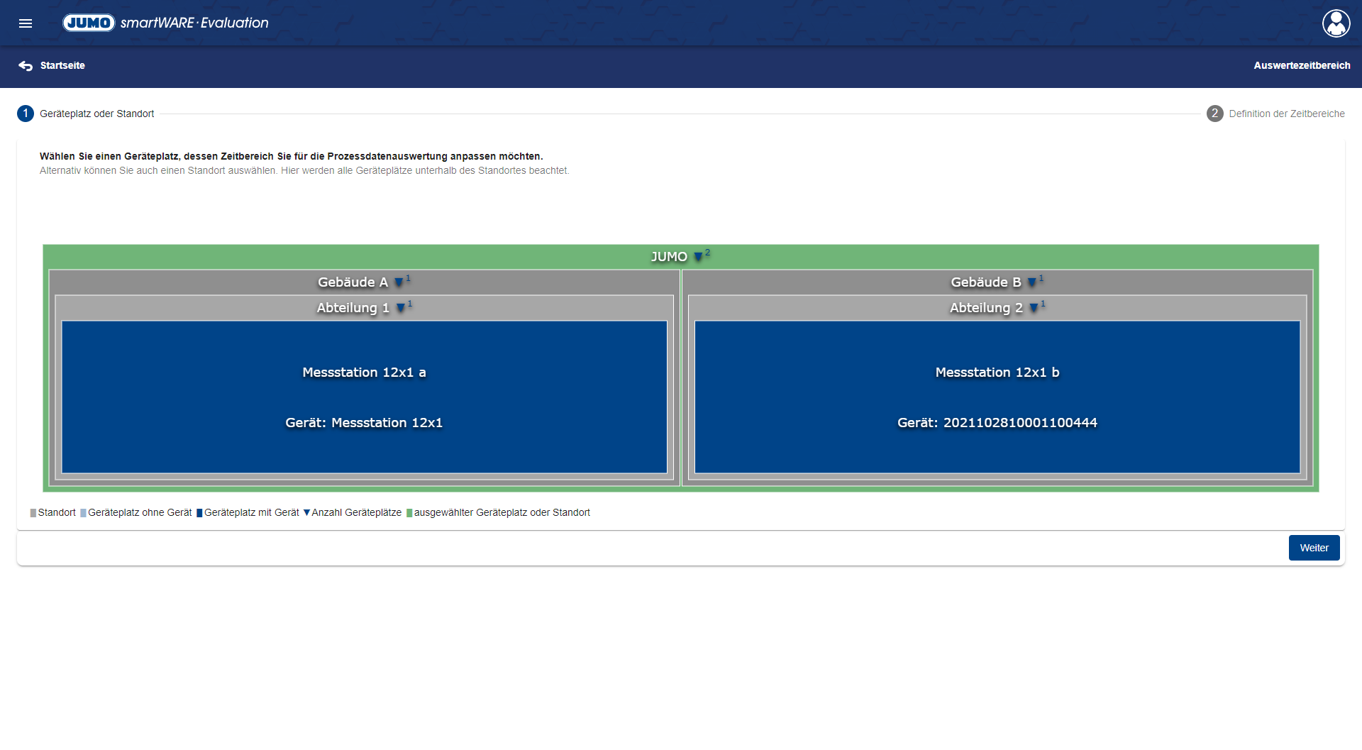 Zunächst muss ein Gerät ausgewählt werden. Dazu kann entweder direkt ein Geräteplatz oder ein übergeordneter Standort ausgewählt werden. Sollte ein Standort ausgewählt werden, kann der Auswertezeitbereich für alle darunter liegenden Geräte bestimmt werden.
