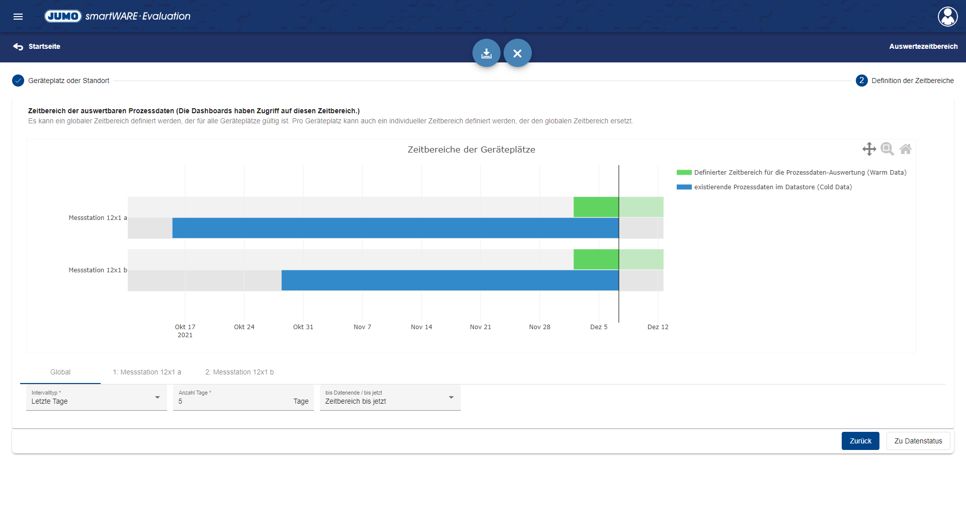 Im Menüpunkt Auswertezeitbereich wird festgelegt, auf welchen Zeitbereich der vorhandenen Daten eines verbundenen Geräts Dashboards zugreifen können. Cold Data wird hier in Warm Data “umgewandelt”.