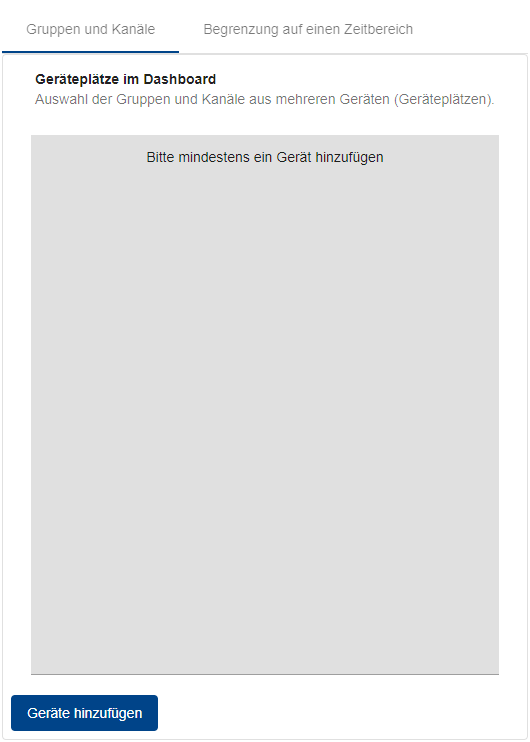 Sollte ein Geräteplatz als Standort ausgewählt worden sein, werden die Geräte des Geräteplatzes automatisch links in der Liste angezeigt. Sollte ein Standort ausgewählt worden sein, kann über den Button “Geräte hinzufügen” ein beliebiges Gerät zum Dashboard hinzugefügt werden.
