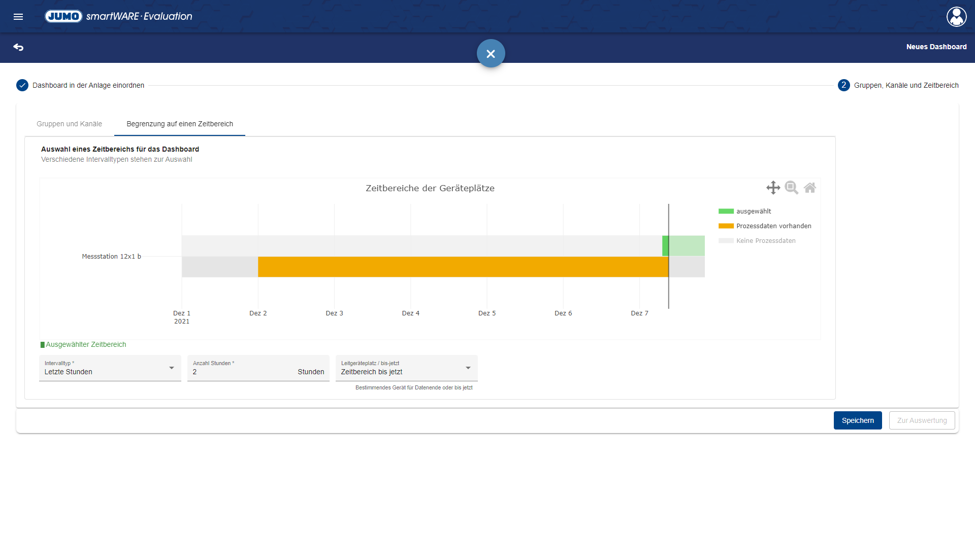 Letzte Tage | Mit dieser Einstellung kann die Anzahl der Tage festgelegt werden um den der Zeitbereich in die Vergangenheit wächst. Hier besteht zudem die Option den Zeitbereich bis Datenende eines Geräts oder bis jetzt, also dem aktuellen Zeitpunkt, laufen zu lassen. |