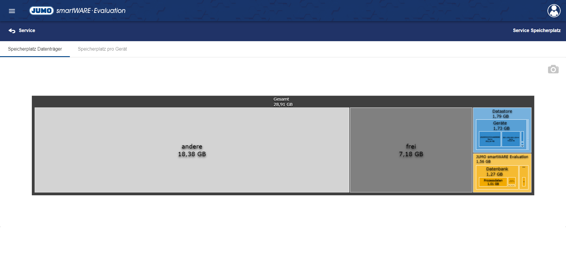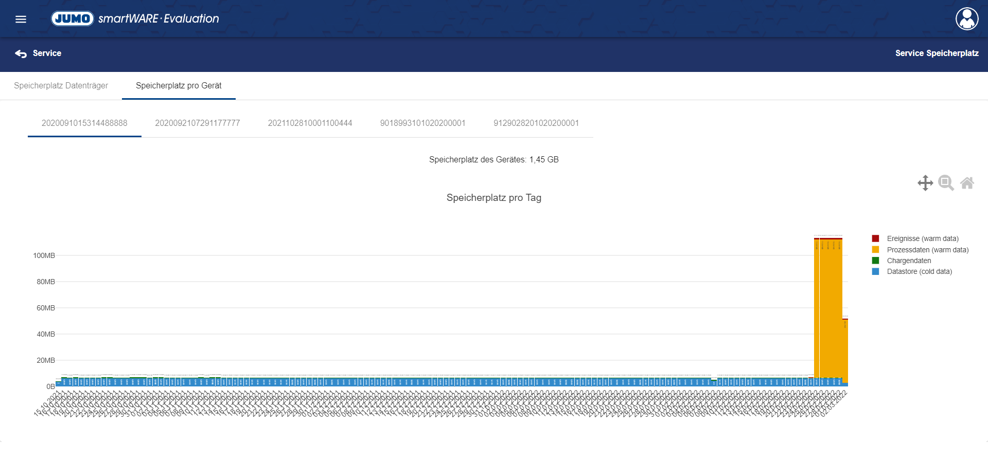 In diesem Tab sieht man den Speicherverbrauch pro Gerät. Das Gerät kann im oben-liegenden Menü ausgewählt werden und ist nach der Fabrikationsnummer benannt.