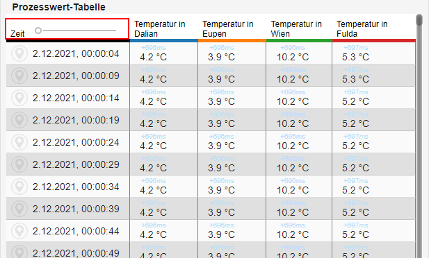 Es besteht die Möglichkeit für einzelne Werte einen Marker im Diagramm zu setzen. Per Linksklick auf eine Tabellenzeile aktiviert sich der Marker für diesen Wert. Mit Hilfe des Sliders in der Prozesswert-Tabelle kann von einem Marker zum anderen gesprungen werden.