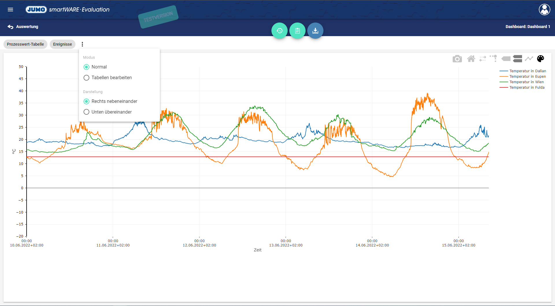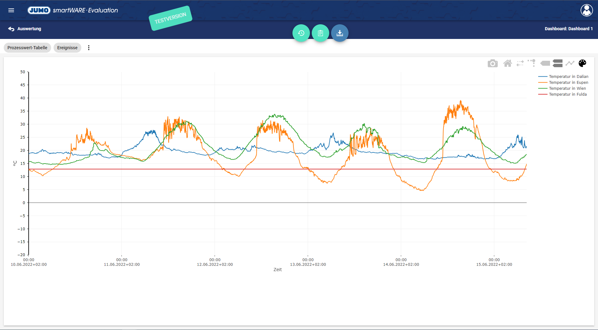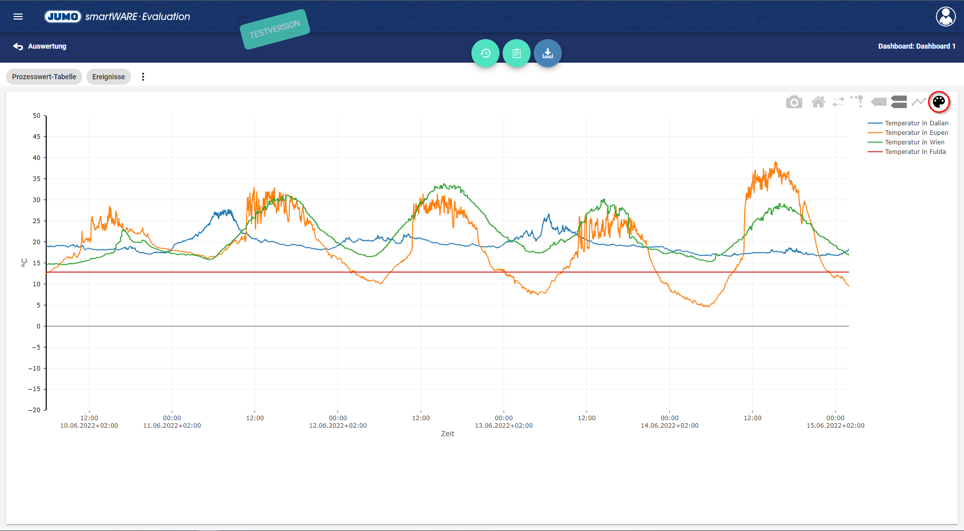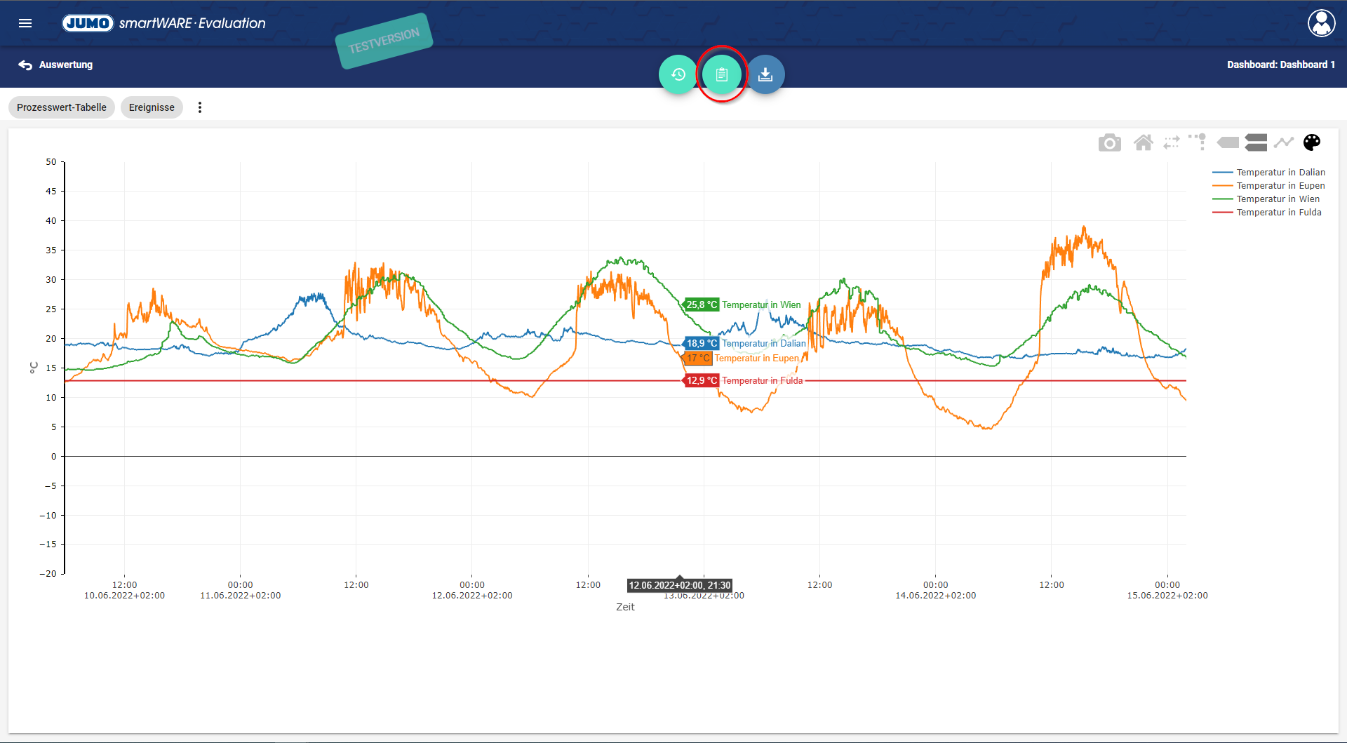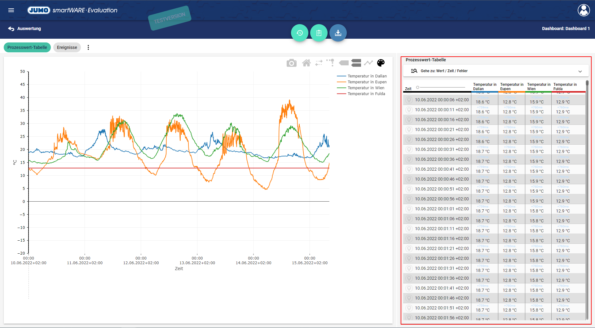 Die Prozesswert-Tabelle gibt einen Überblick über alle zur Verfügung stehenden Werte der verschiedenen abgebildeten Kanäle für das Dashboard.