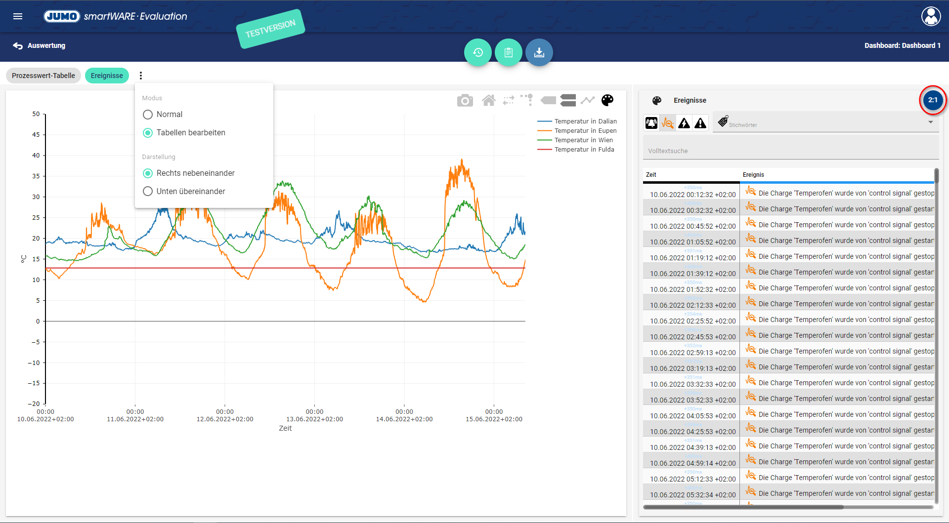 Tabelle bearbeiten → Es erscheint ein neuer Button für die Prozesswert-Tabelle und Ereignisse auf der Seite, mit dem die Aufteilung der Tabellen und Darstellung definiert werden kann.