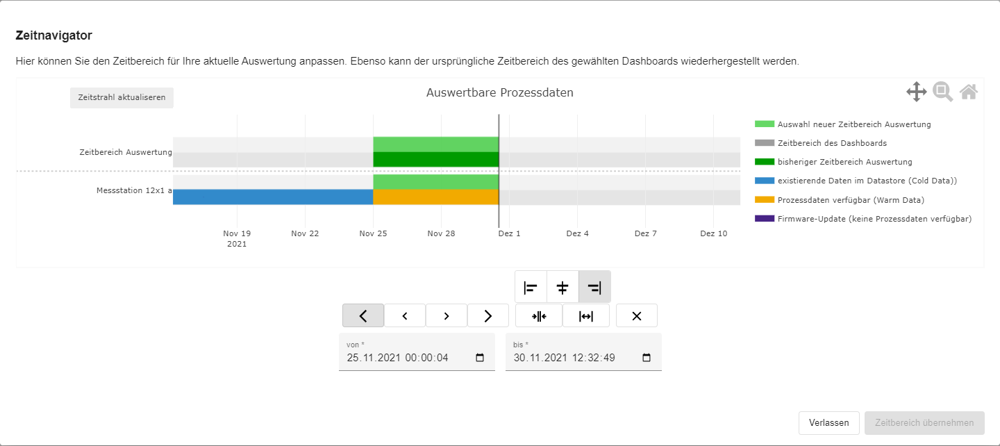 Der Zeitnavigator bietet die Möglichkeit den ausgewählten Zeitbereich innerhalb der Auswertung anzupassen. Dabei kann nicht nur auf die Warm Data zugegriffen werden, sondern auch Daten, die nur als Cold Data zur Verfügung stehen können ausgewählt werden. Per Klick auf “Zeitbereich übernehmen” werden diese Daten zu Warm Data aufbereitet und daraufhin in der Auswertung angezeigt.