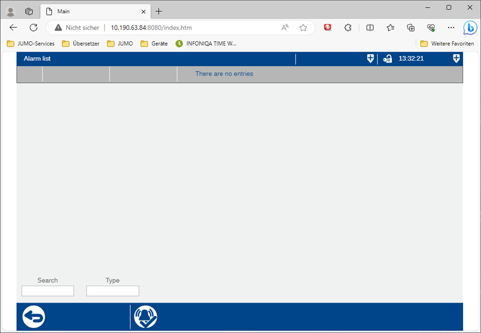 In diesem Untermenü werden aktuelle Alarmmeldungen des Geräts chronologisch in einer Liste dargestellt. Die Liste wird automatisch aktualisiert. Die Darstellung lässt sich nach der Art der Meldung filtern (Alarm, Störung).