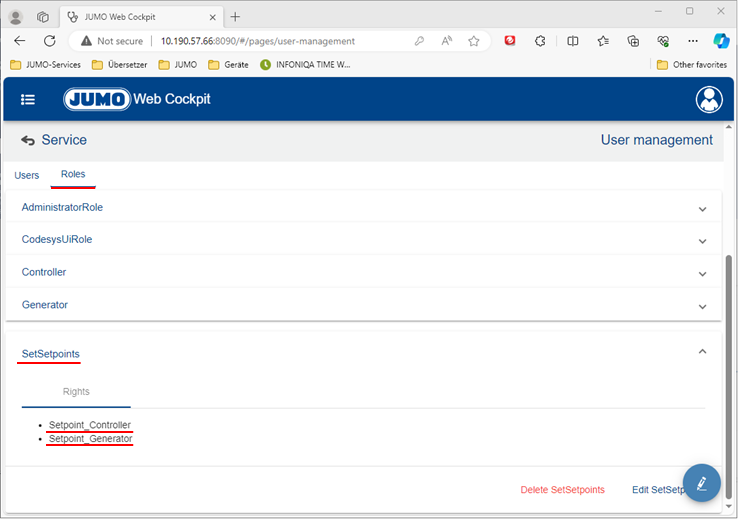 In diesem Beispiel wird eine Rolle mit zwei Rechten angelegt. Die Rolle hat die Bezeichnung SetSetpoints und die Rechte haben die Bezeichnungen Setpoint_Controller und Setpoint_Generator.