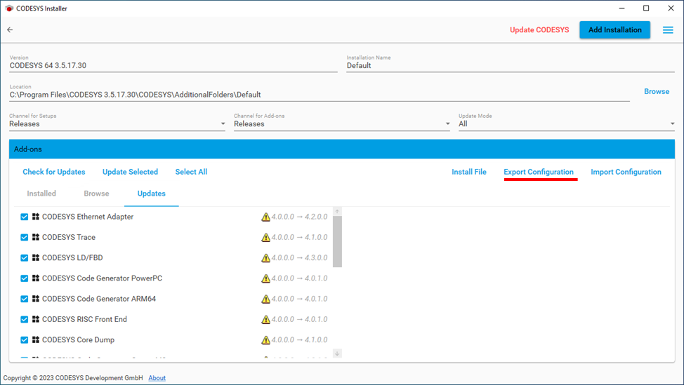 Im CODESYS Installer kann in jeder Installation ein Change-Fenster aufgerufen werden. Über den Button ‘Export Configuration’ kann die aktuelle Entwicklungsumgebung in eine ‘installation-config’-Datei abgespeichert werden.