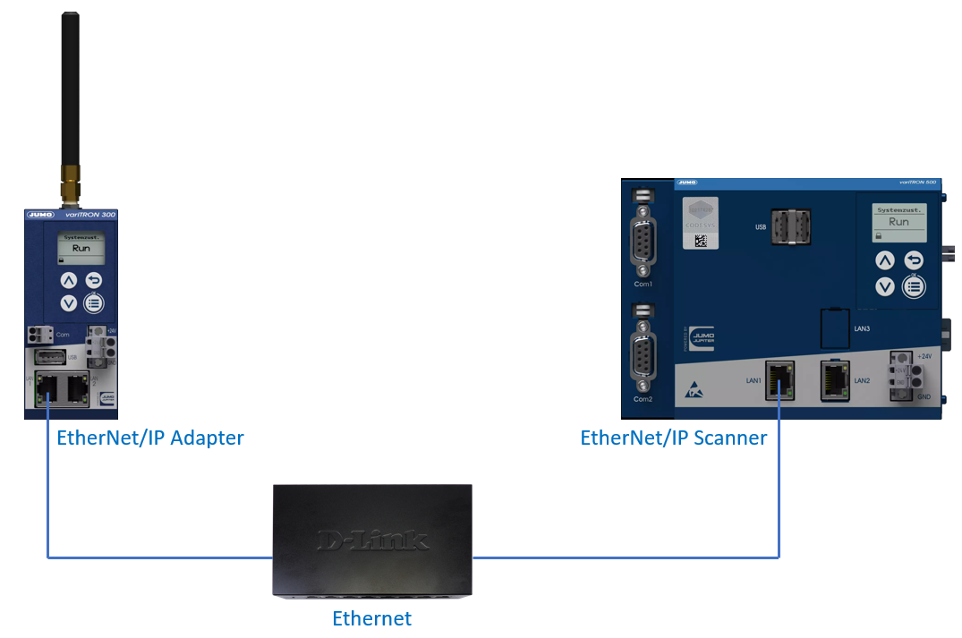 Im folgenden Beispiel erfolgt eine Scanner-Adapter Anbindung per EtherNet/IP zweier variTRON-Systeme über ein LAN.