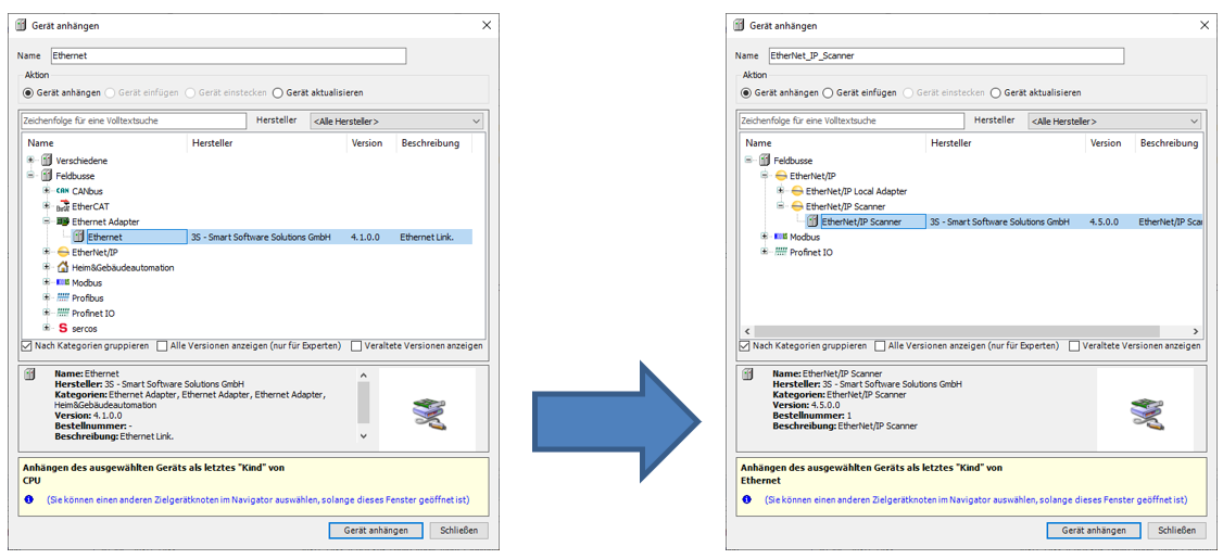 Anschließend wird über den Menüpunkt Add Device… des Kontextmenü des Ethernet-Devices, der Ethernet/IP Scanner hinzugefügt.