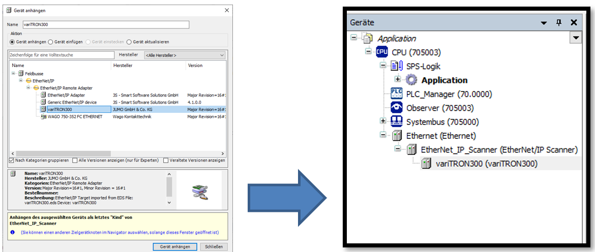 Nachdem der EtherNet/IP Scanner angehängt wurde, taucht nun als Adapter unter anderem das JUMO-Gerät auf, das im ersten Kapitel installiert wurde.