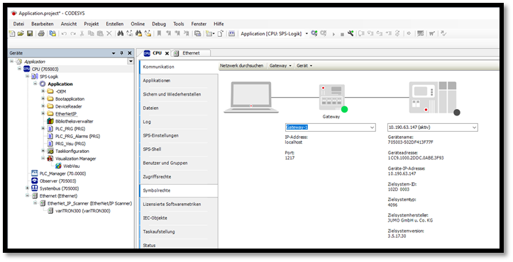 Das CODEYS Development System mit der CPU verbinden, indem im Bereich Kommunikation die Adresse des Zielgerätes eingegeben und aktiviert wird.