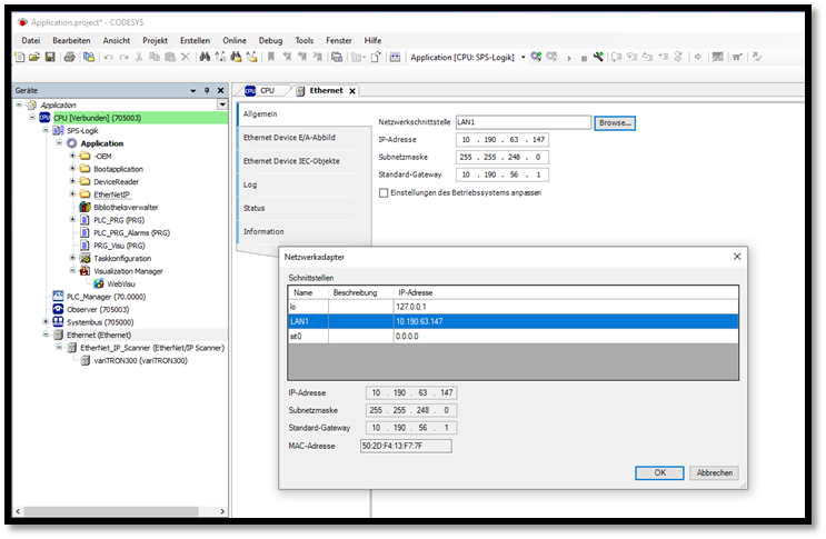 Nun kann in Ethernet, die Netzwerkschnittstelle, über die die EtherNet/IP Kommunikation laufen soll, ausgewählt werden.