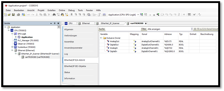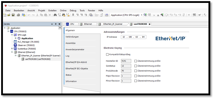 In der Baumstruktur werden unter EtherNet/IP_Scanner alle Adapter aufgelistet. Auch das variTRON-Gerät. Unter Allgemein, muss man nun die IP-Adresse des variTRON eingeben. Unter Kompatibilitätsprüfung kann die CODESYS kontrollieren, ob der Scanner mit dem richtigen Adapter verbunden ist (kann wahlweise auch deaktiviert werden).