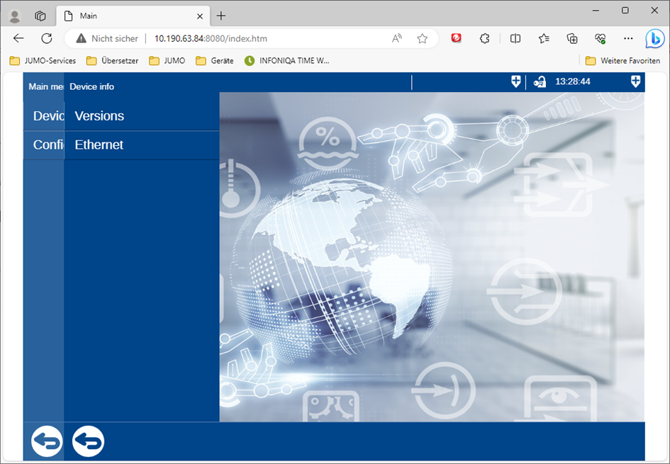 Über die Taste Hauptmenü in der Navigationsleiste öffnet sich der Bereich mit den Menüs für Geräteinfo und Konfiguration, wobei der Menüpunkt Geräteinfo auch bei nicht angemeldetem Benutzer vorhanden ist.