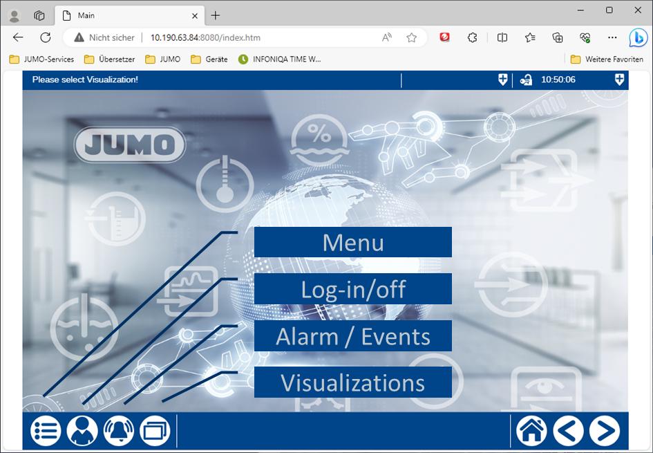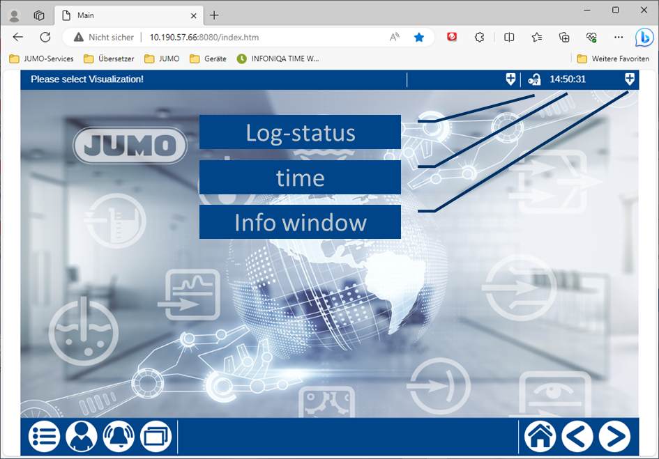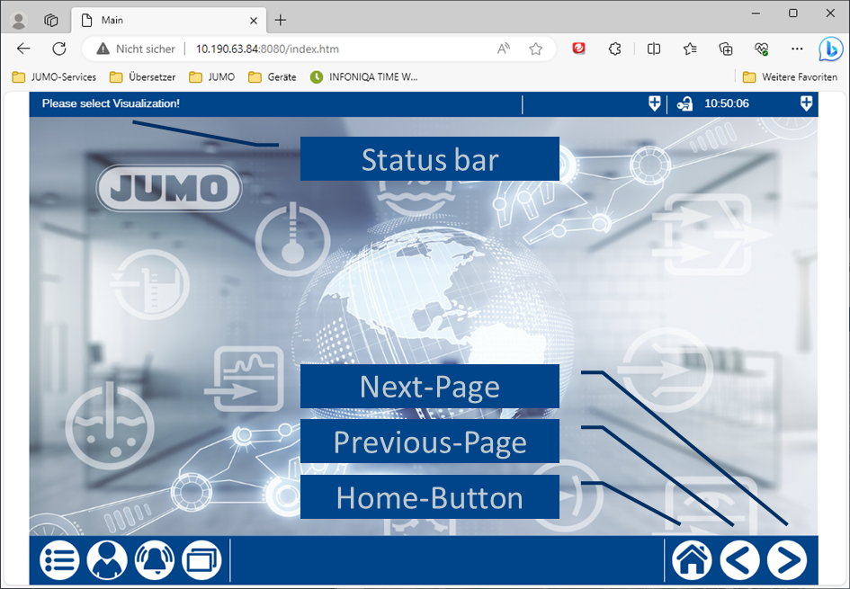 Im Startbild, in welchem ein zentrales Visualisierungfenster von einer Statusleiste oben und einer Navigationsleiste unten gesäumt ist, gibt es feste Anordnungen von Bedien- und Anzeigeelementen: