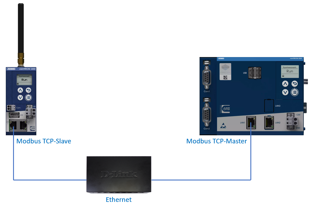 Im folgenden Beispiel erfolgt eine Modbus TCP Master-Slave-Kommunikation zweier variTRON-Systeme über ein LAN.