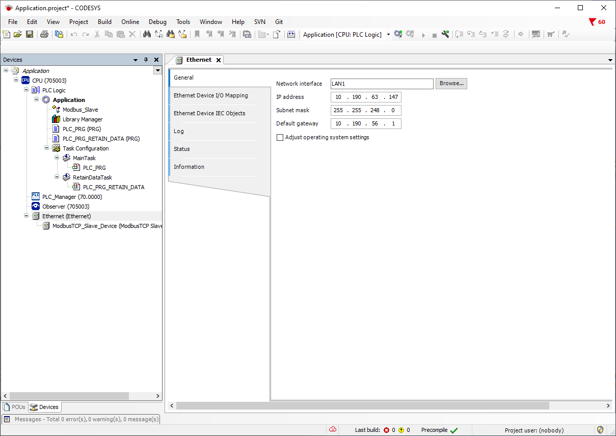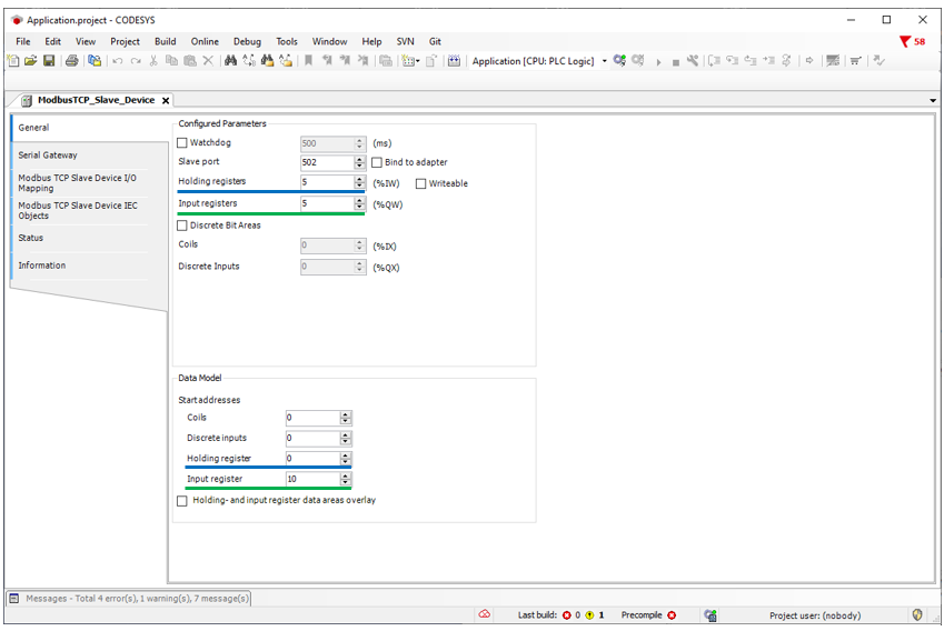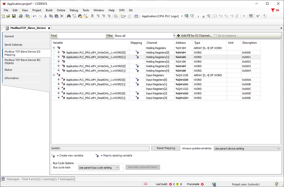 Zu guter Letzt werden im Modbus TCP Slave Device I/O Mapping in den Registern die gewünschten Variablen deklariert oder diese auf Variablen der Applikation gemappt.