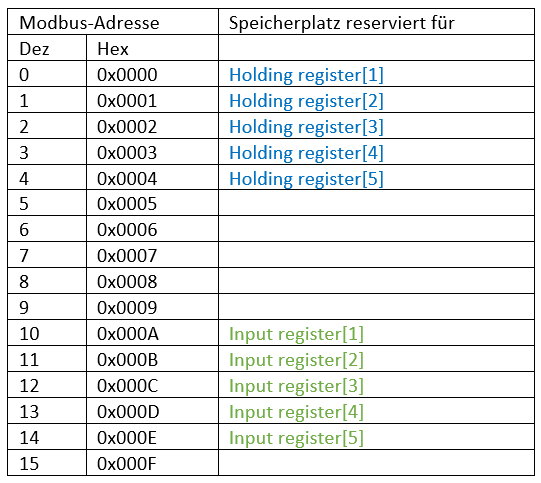 Man kann sich den adressierbaren Bereich wie eine Excel-Tabelle vorstellen, die aufsteigend nummeriert ist. Da im Beispiel Holding register die Startadresse 0 hat, werden ab dieser Adresse fünf Speicherplätze für Input reserviert. Die Startadresse für Input register hat die Startadresse 10 und daher werden ab dieser Adresse fünf Speicherplätze für Output reserviert.