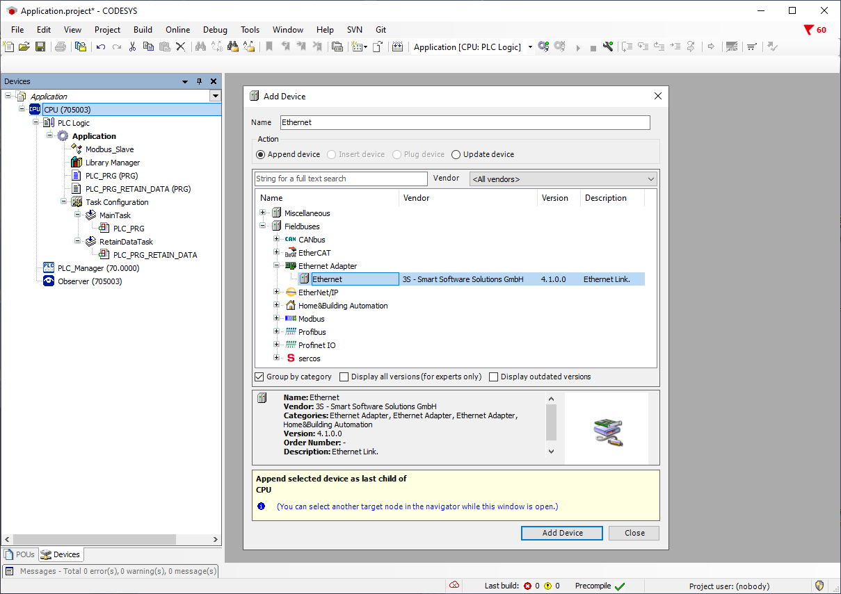 Beim dem variTRON, welches als Modbus TCP Slave dienen soll, muss über das Kontextmenü der CPU und dem Menüpunkt Add Device… die Schnittstelle Ethernet hinzugefügt werden.