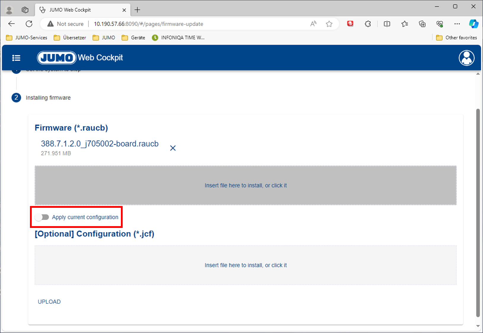 Der Schalter für “Apply current configuration” ist nur ab der Firmwareversion 8 sichtbar. Hierüber kann entschieden werden, ob die aktuelle Konfiguration erhalten werden soll.