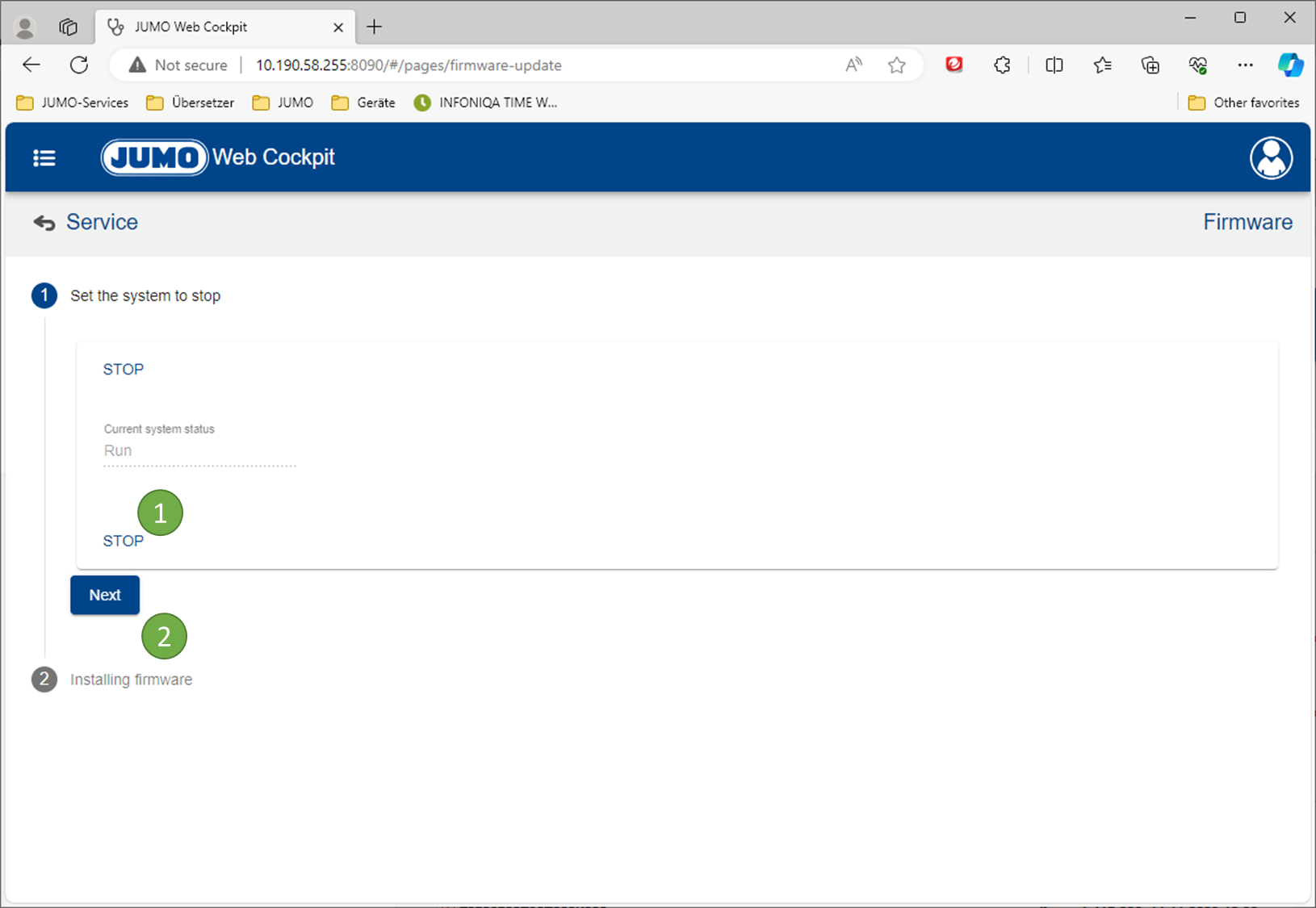 Über Service → Firmware kommt man zum folgenden Fenster. Erst muss der variTRON gestoppt :No1: und über “Next” :No2: kann zum nächsten Schritt gesprungen werden.