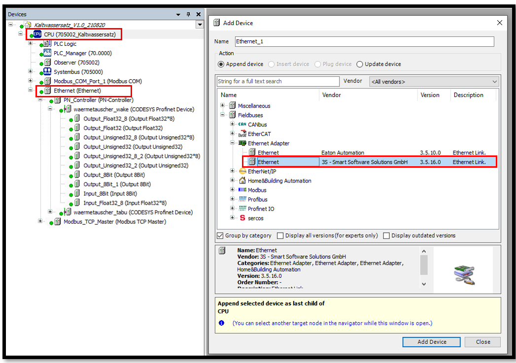 Beim dem variTRON, welches als Profinet-Controller dienen soll, muss über das Kontextmenü der CPU und dem Menüpunkt Add Device… die Schnittstelle Ethernet hinzugefügt werden.