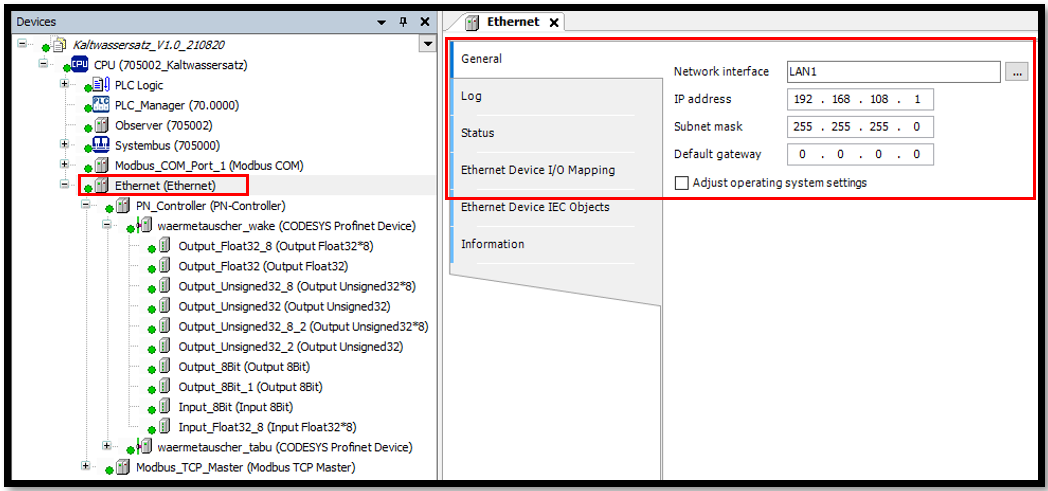 Am Ethernet-Device muss unter General das Network interface (LAN-Port) gewählt werden, worüber die Kommunikation erfolgen soll.