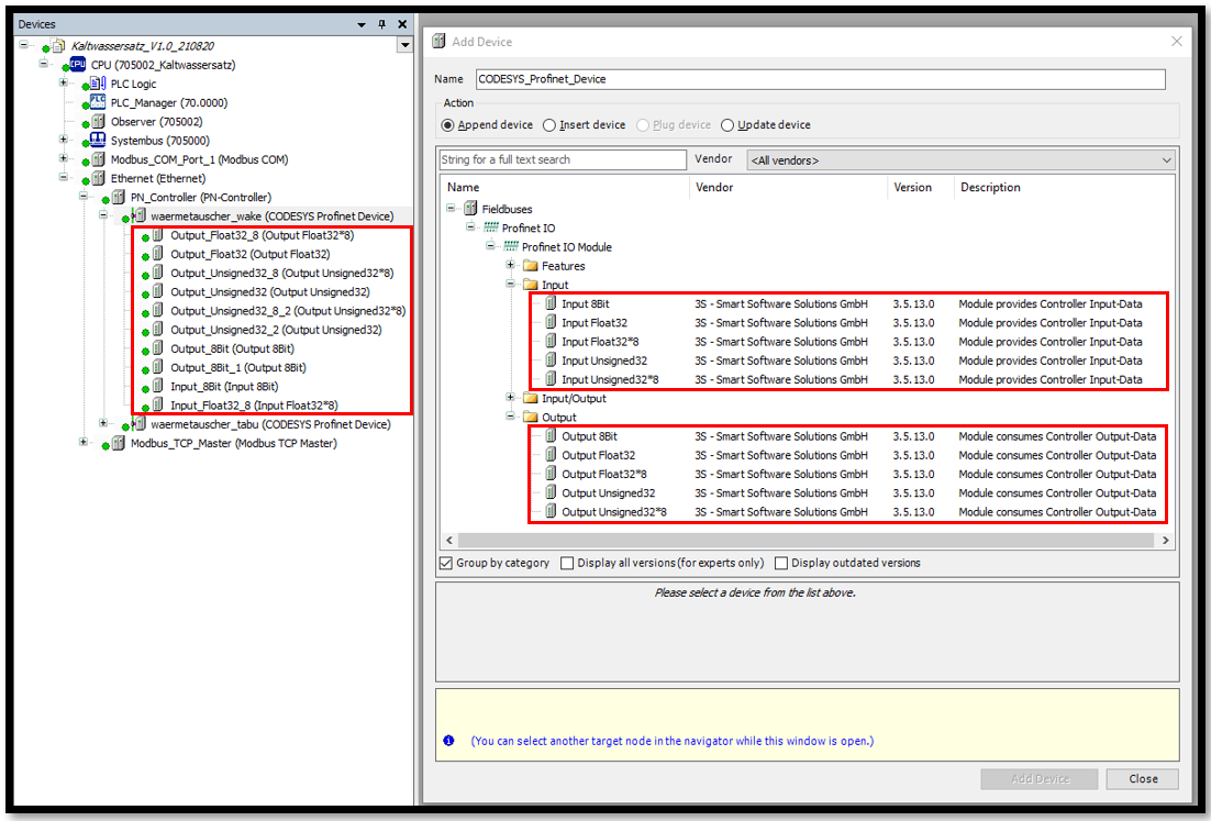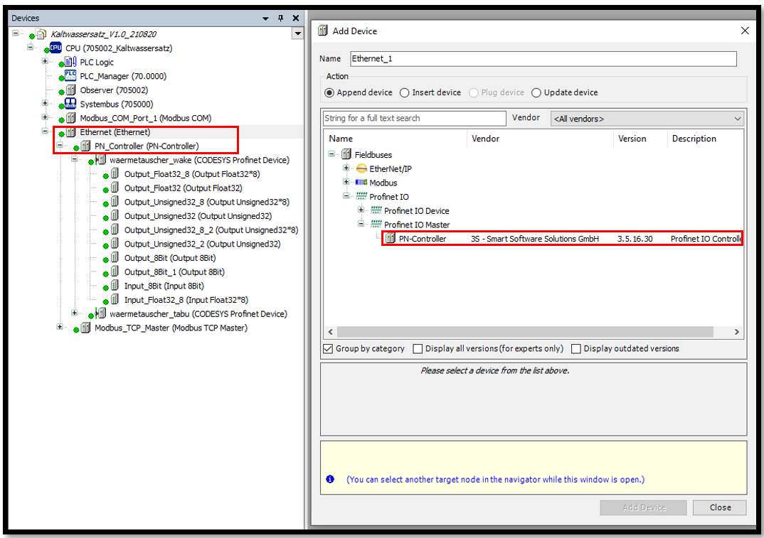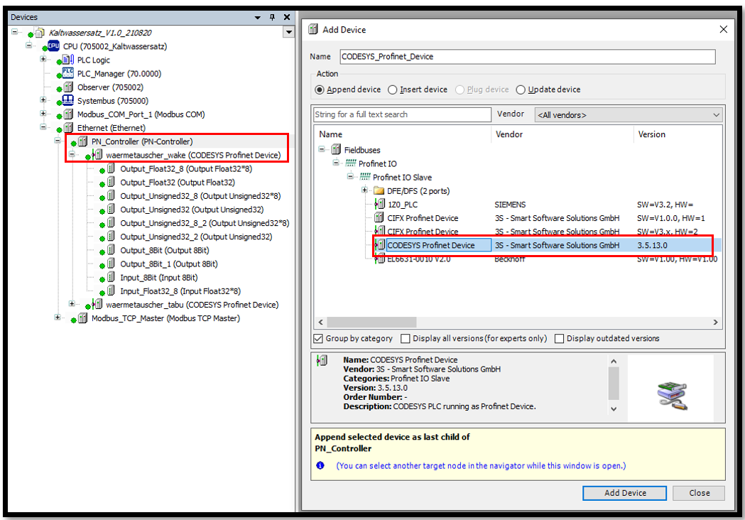 Anschließend wird über den Menüpunkt Add Device… des Kontextmenü des PN-Controllers, der CODESYS Profinet Device hinzugefügt.