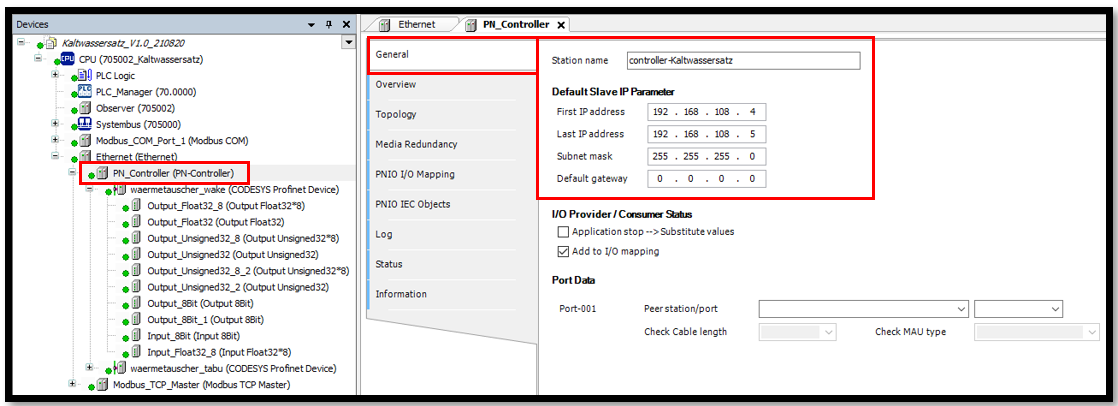 Am PN-Controller muss unter General der Stationsname und die IP-Parameter des Slaves konfiguriert werden.