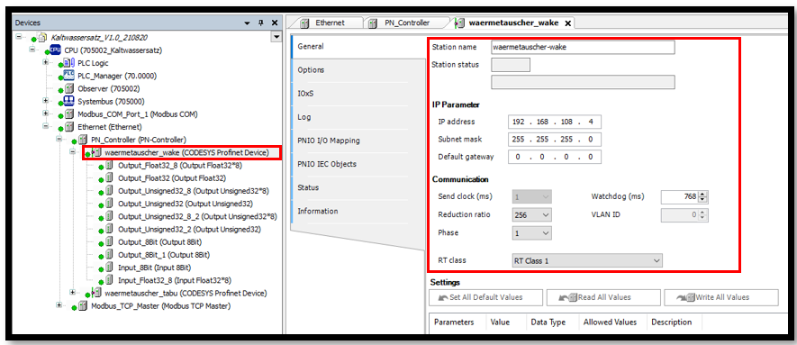 Den PN-Device mit Stationsname und IP-Adresse konfigurieren. Die eingestellten Kommunikationsparameter (Reduction ratio) sind Erfahrungswerte.