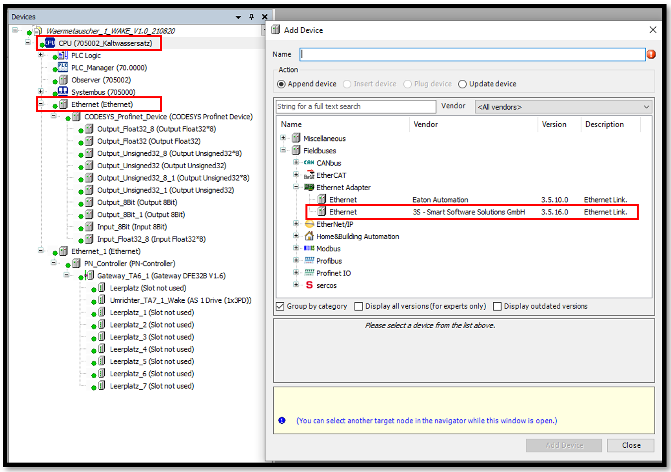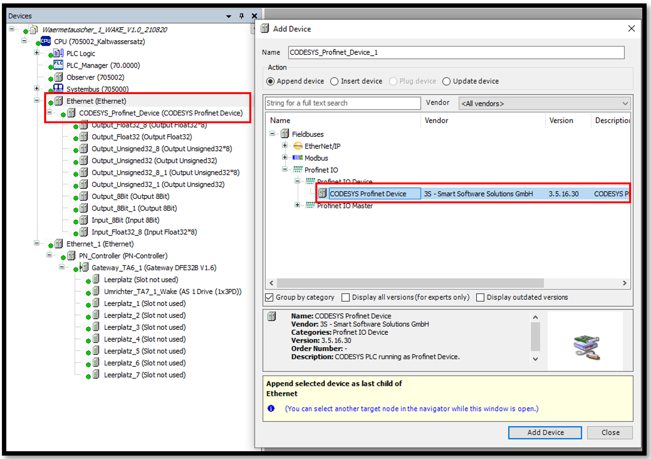 Anschließend wird über den Menüpunkt Add Device… des Kontextmenü des Ethernet-Devices, der CODESYS Profinet Device hinzugefügt.