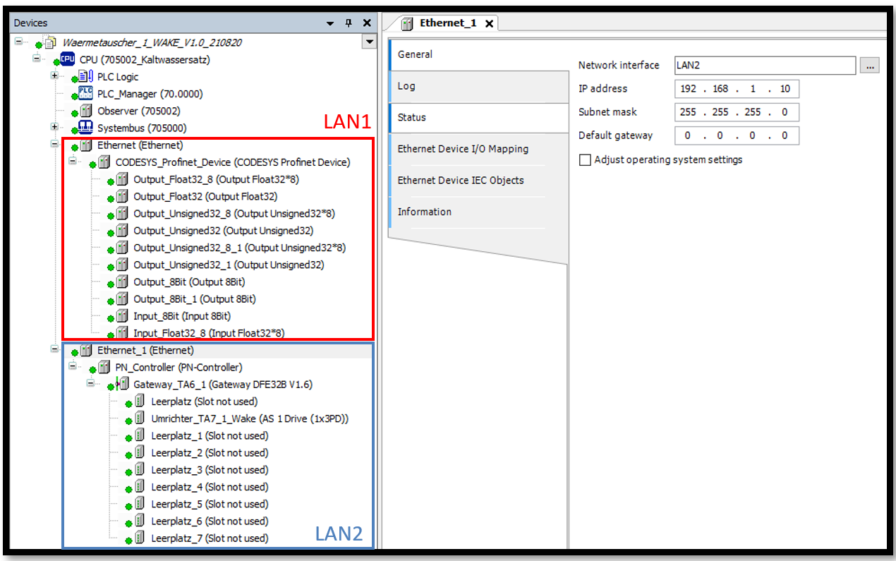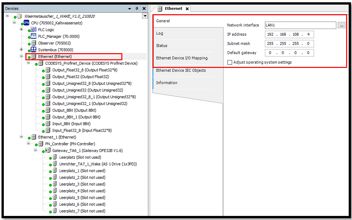 Am Ethernet-Device muss unter General das Network interface (LAN-Port) gewählt werden, worüber die Kommunikation erfolgen soll. Die IP Adresse muss identisch zur IP Adresse des Devices sein, welcher im PN-Controller anleget wurde.