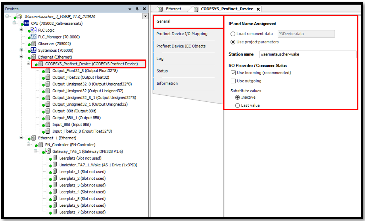 Am PN-Device muss unter General die Konfiguration vorgenommen werden. Der Stationsname muss dabei identisch zum Stationsname der Device-Konfiguration im PN-Controller sein.