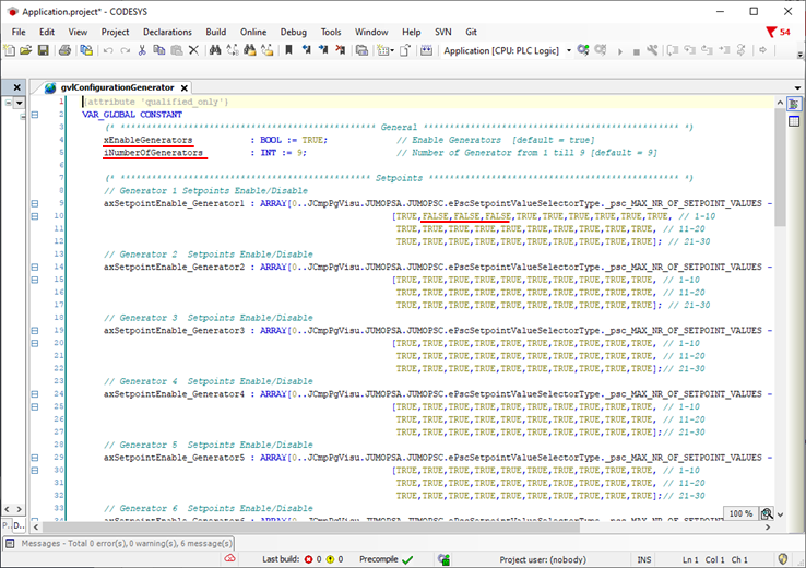 In der CODESYS wird in der globalen Variablenliste ‘gvlConfigurationGenerator' die Anzahl der benötigten Programmgeber festgelegt (kann auch 0 sein). Die Anzahl der aktiven Programmgeber sollte speziell für den variTRON 300 zur Reduzierung der CPU-Last auf das notwendige Maß eingestellt werden. Darüber hinaus können hier auch nicht benötigte Sollwerte und Steuerkontakte ausgeblendet werden.
