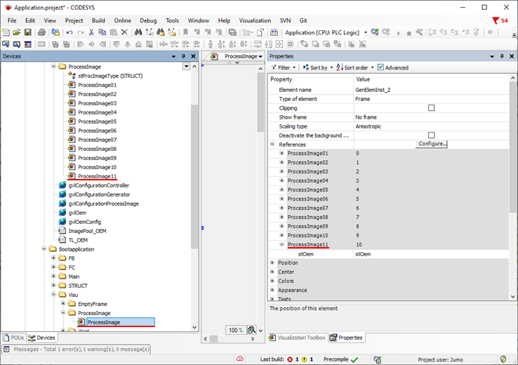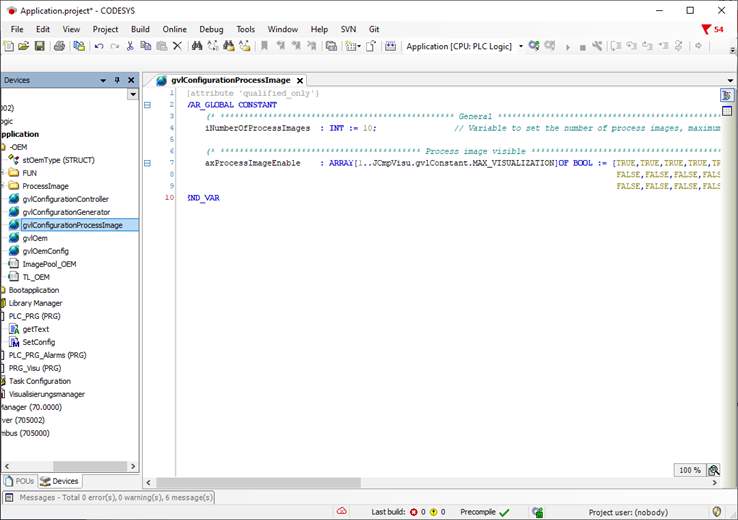 Prozessbilder sind vordefinierte Visualisierungen, welche den Erfordernissen der Applikation angepasst werden können. Für den Fall, dass die standardmäßig vorhandenen zehn Prozessbilder nicht ausreichen, können bis zu 20 weitere Prozessbilder hinzugefügt werden. Hierfür muss in der Konfigurationsdatei ‘gvlConfigurationProcessImage’ die Anzahl der Prozessbilder auf den gewünschten Wert geändert werden. Anschließend müssen in der Feld-Variable axProcessImageEnable die benötigten Prozessbilder durch TRUE-Werte in der Initialisierung aktiviert werden. Im letzten Schritt werden die benötigten Prozessbilder dupliziert, umbenannt und der Visualisierung 'ProcessImage' hinzugefügt.