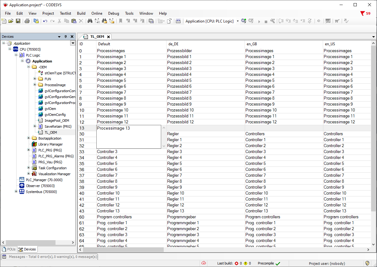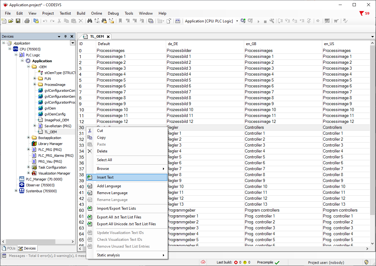 Ergänzend hierzu müssen in der Textliste ‘TL_OEM’ im Anschluss an den Eintrag für Processimage12, die Prozessbildnamen für die ergänzten Prozessbilder eingetragen werden. Dies erfolgt über Insert Text aus dem Kontextmenü heraus. In diese neue eingefügte Zeile müssen die Prozessbildnamen in allen verfügbaren Sprachen eingetragen werden.