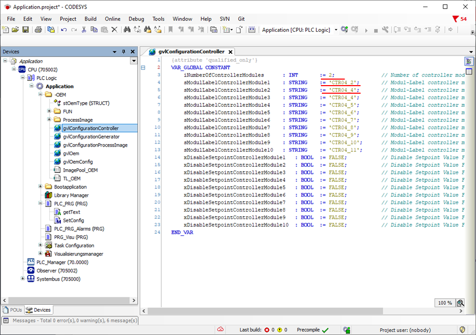 In der globalen Variablenliste ‘gvlConfigurationController’ für die Regler, muss nun die Anzahl der verwendeten Reglermodule und deren Bezeichnungen eingeben werden.