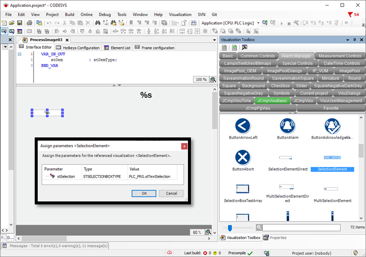 Mit Hilfe des Auswahlobjekts SelectionElement und dem Übergabeparameter vom Typ stSelectionBoxType kann ein Array mit String-Variablen übergeben werden.