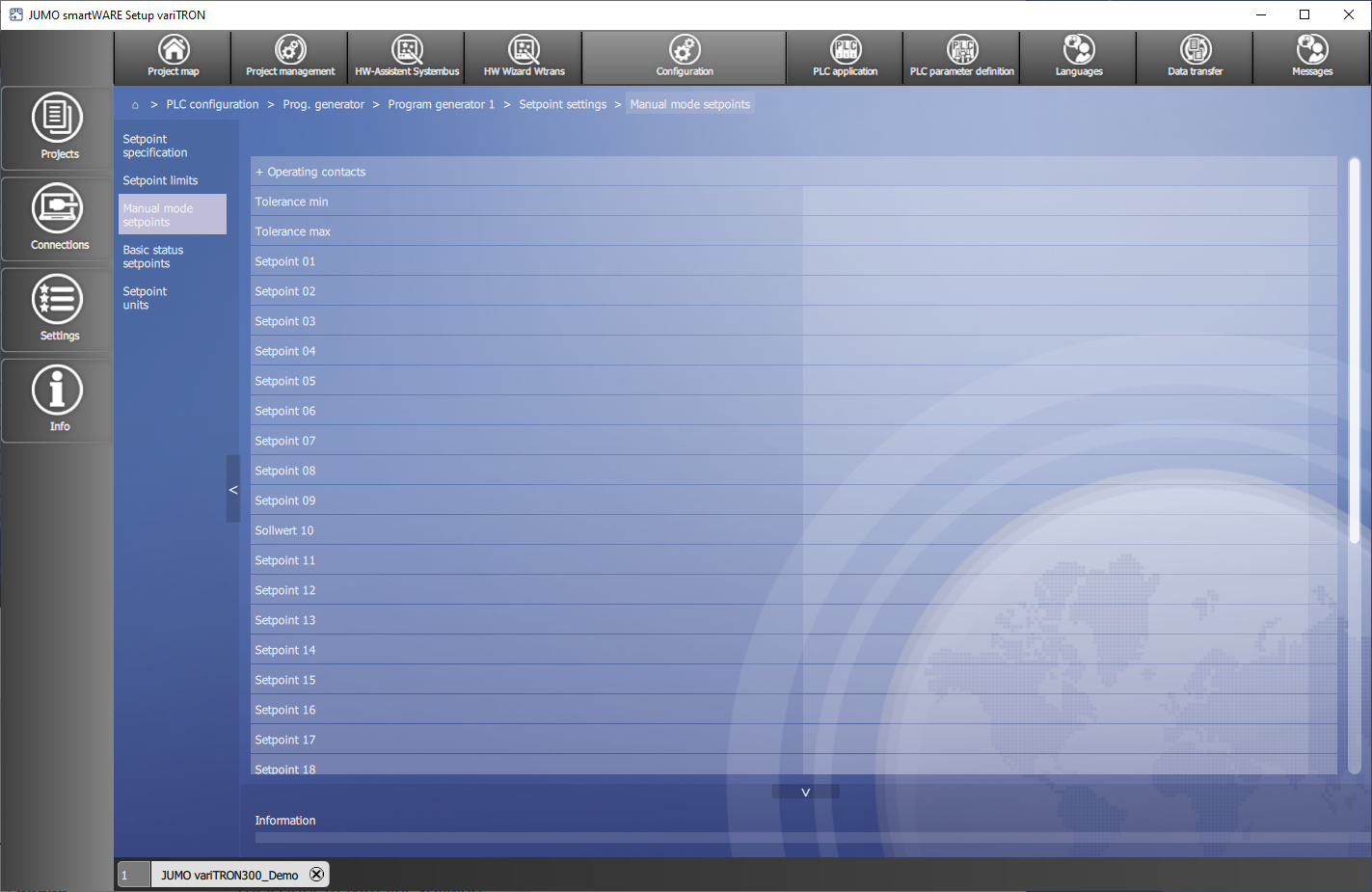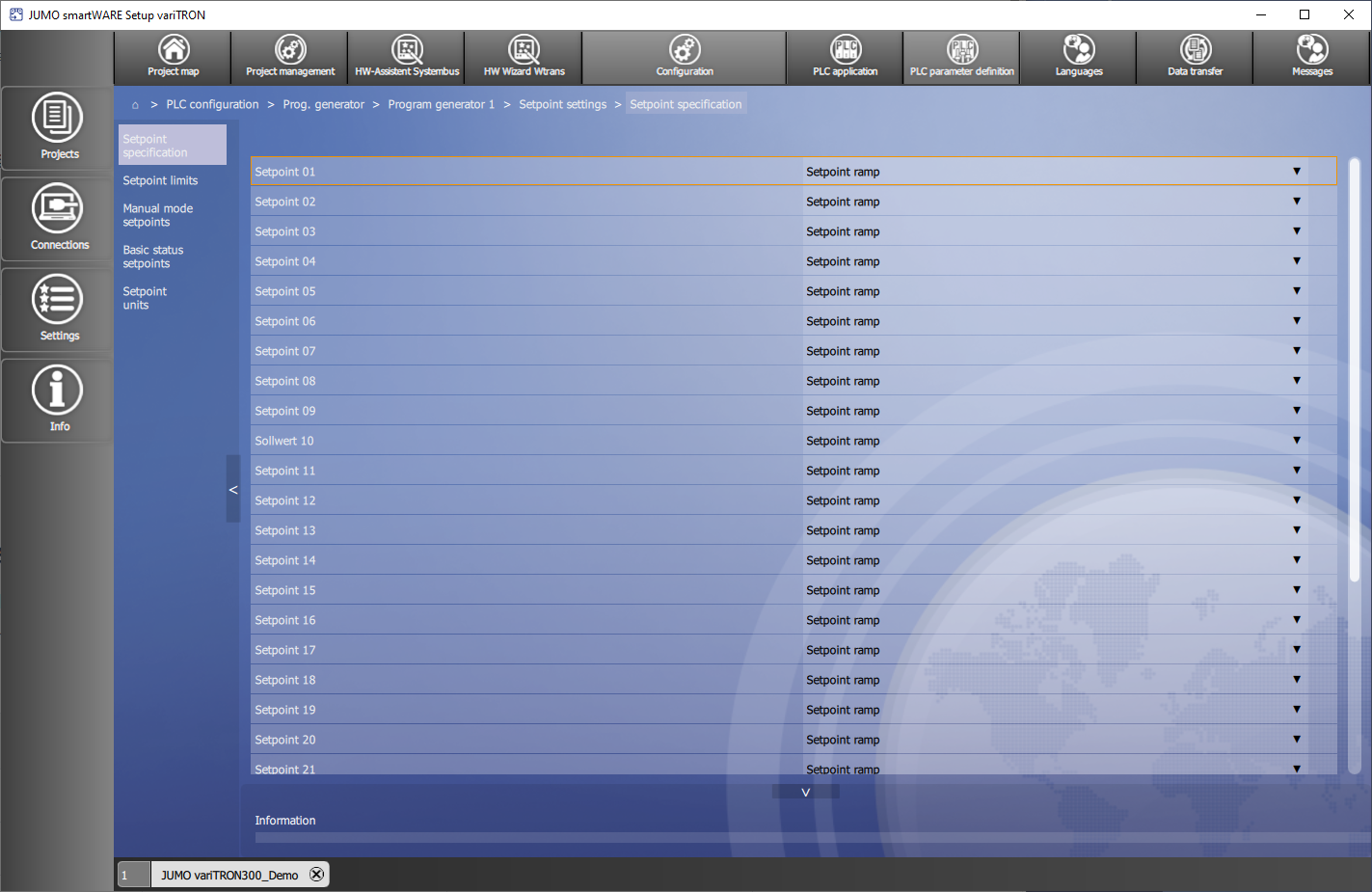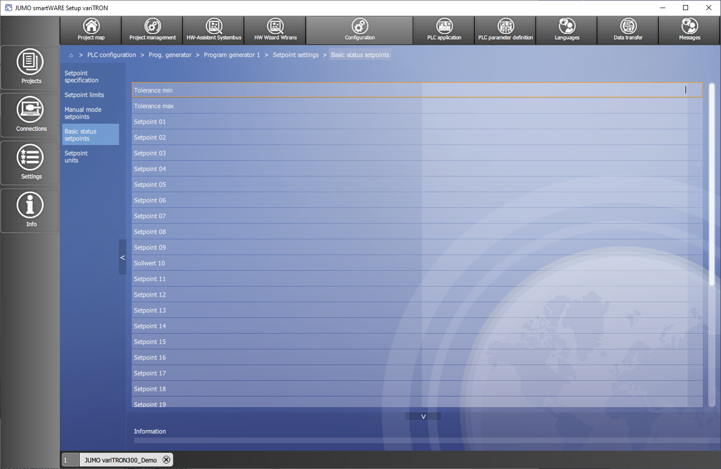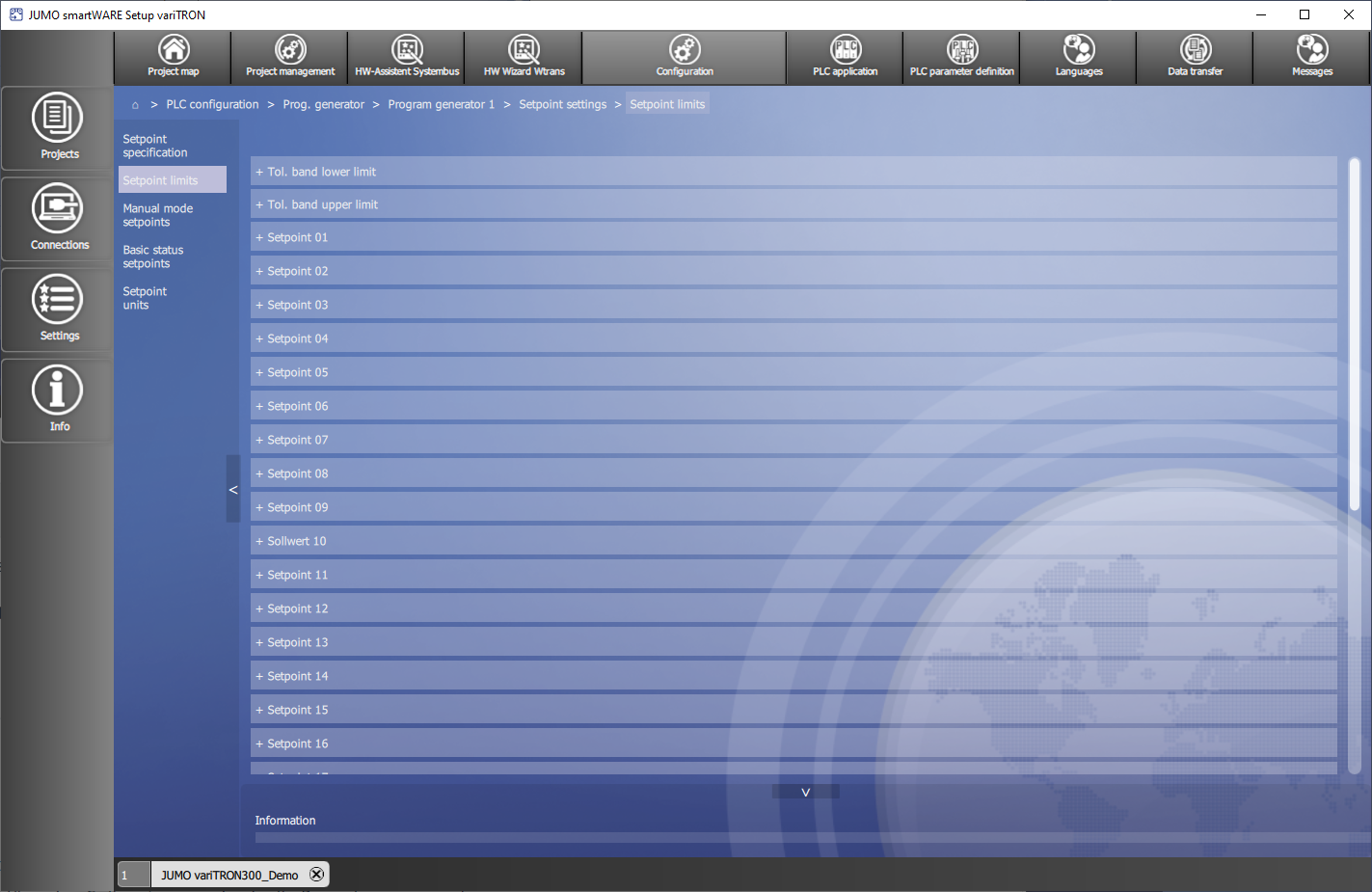 In smartWARE Setup werden im Bereich Configuration unter :Haus: > PLC configuration > Prog. generator > Program generator x > Setpoint settings die Einstellungen für die Sollwerte vorgenommen.