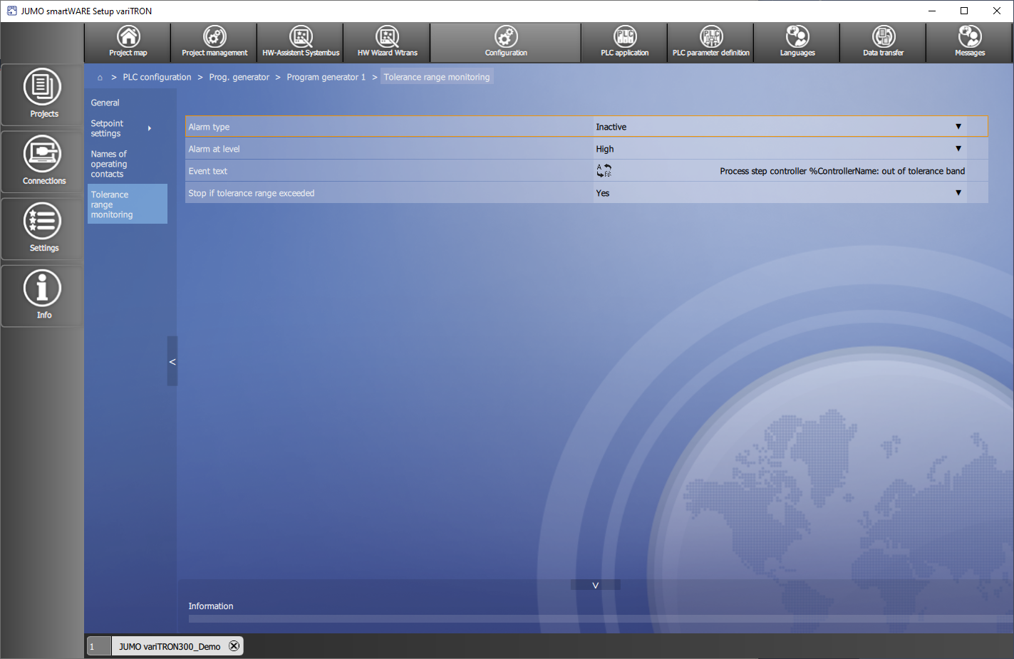 In smartWARE Setup werden im Bereich Configuration unter :Haus: > PLC configuration > Prog. generator > Program generator x > Tolerance range monitoring die Einstellungen des Verhaltens bei Toleranzbandverletzung, festgelegt.
