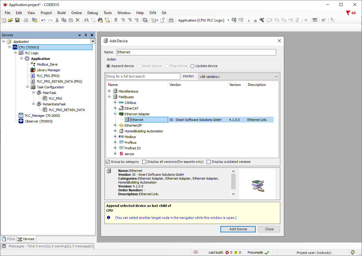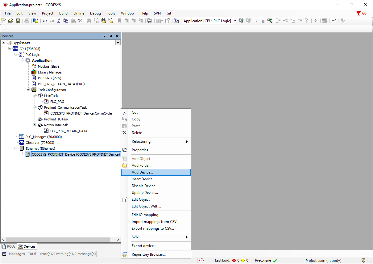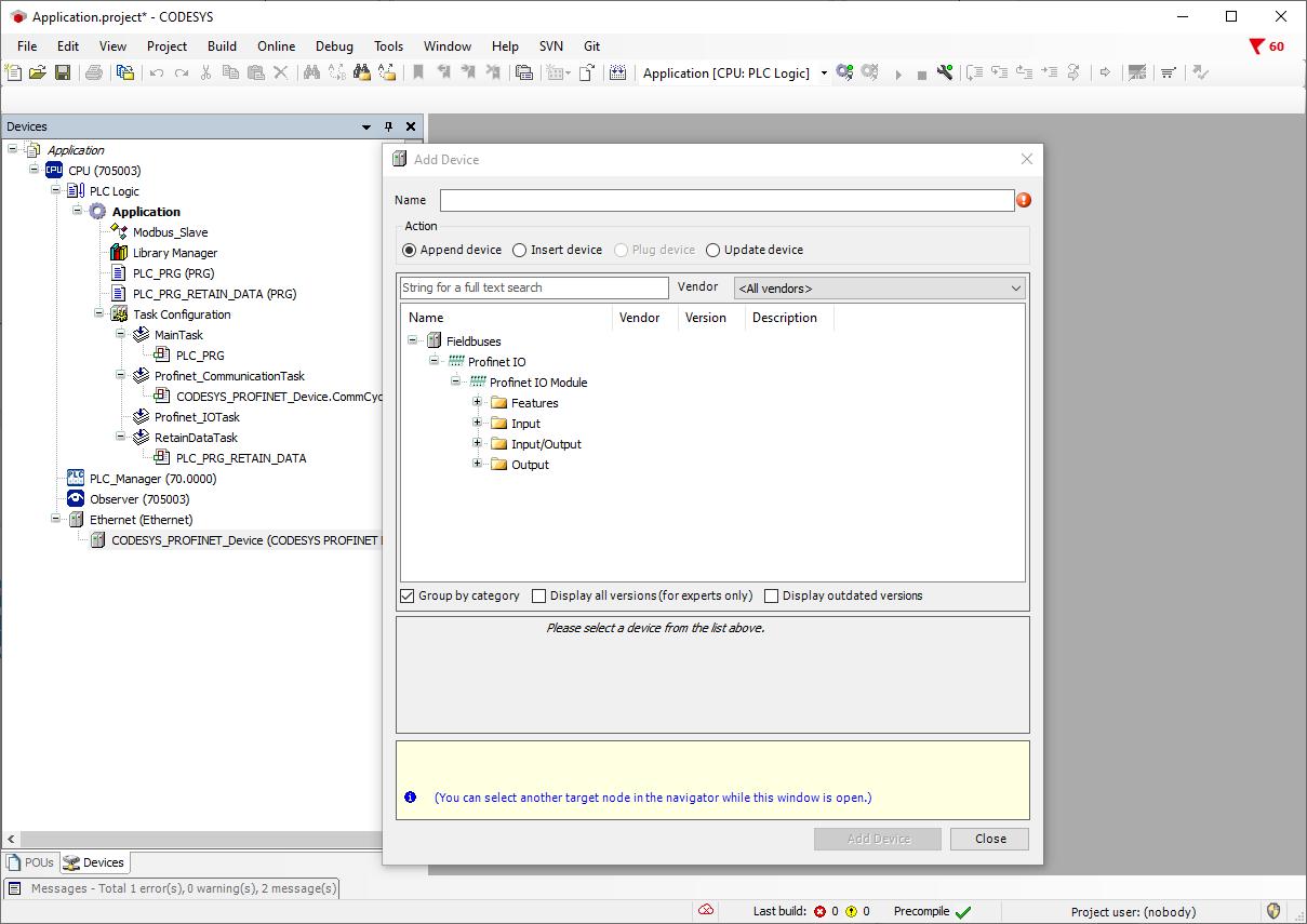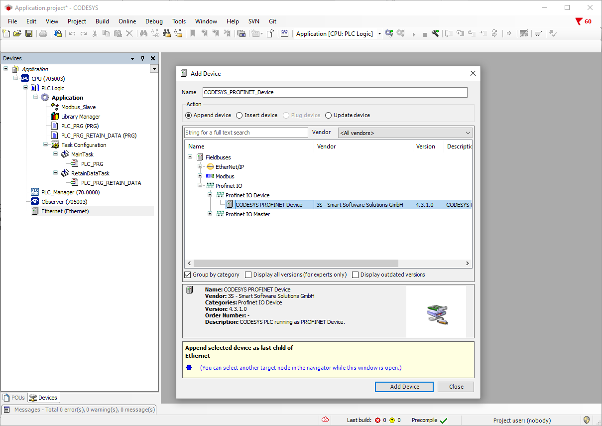 Anschließend wird über den Menüpunkt Add Device… des Kontextmenü des Ethernet-Devices, der CODESYS PROFINET-Device (Fieldbuses → Profinet IO → Profinet IO Device → CODESYS PROFINET Device) hinzugefügt.