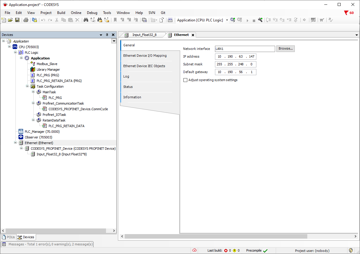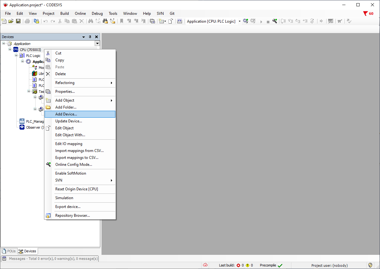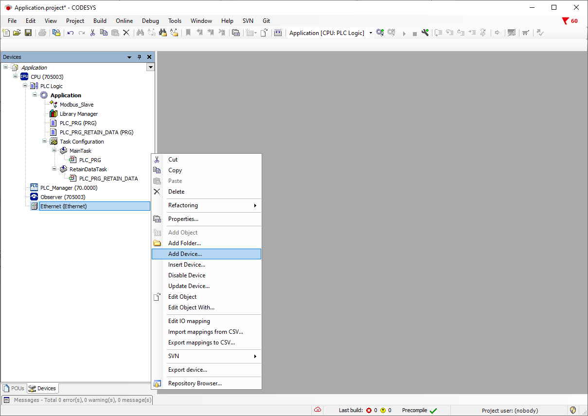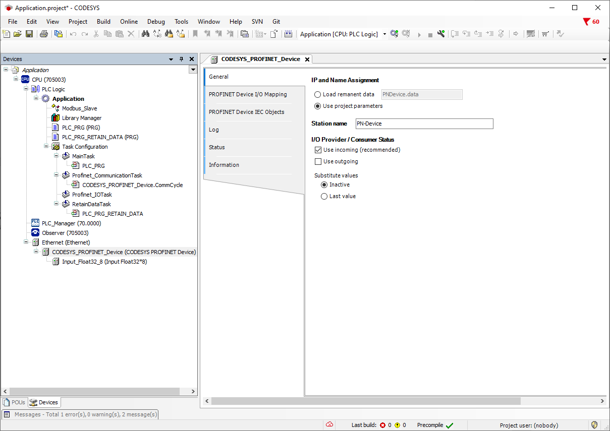 Anschließend wird über den Menüpunkt Add Device… des Kontextmenü des Ethernet-Devices, der CODESYS PROFINET-Device (Fieldbuses → Profinet IO → Profinet IO Device → CODESYS PROFINET Device) hinzugefügt.