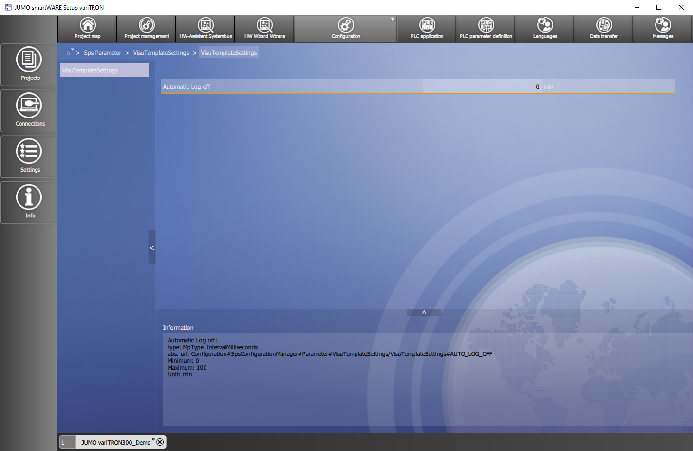 In der Kachel Configuration findet man unter :Haus: > Sps Parameter > VisuTemplateSettings > VisuTemplateSettings die Einstellung für die automatische Abmeldung.