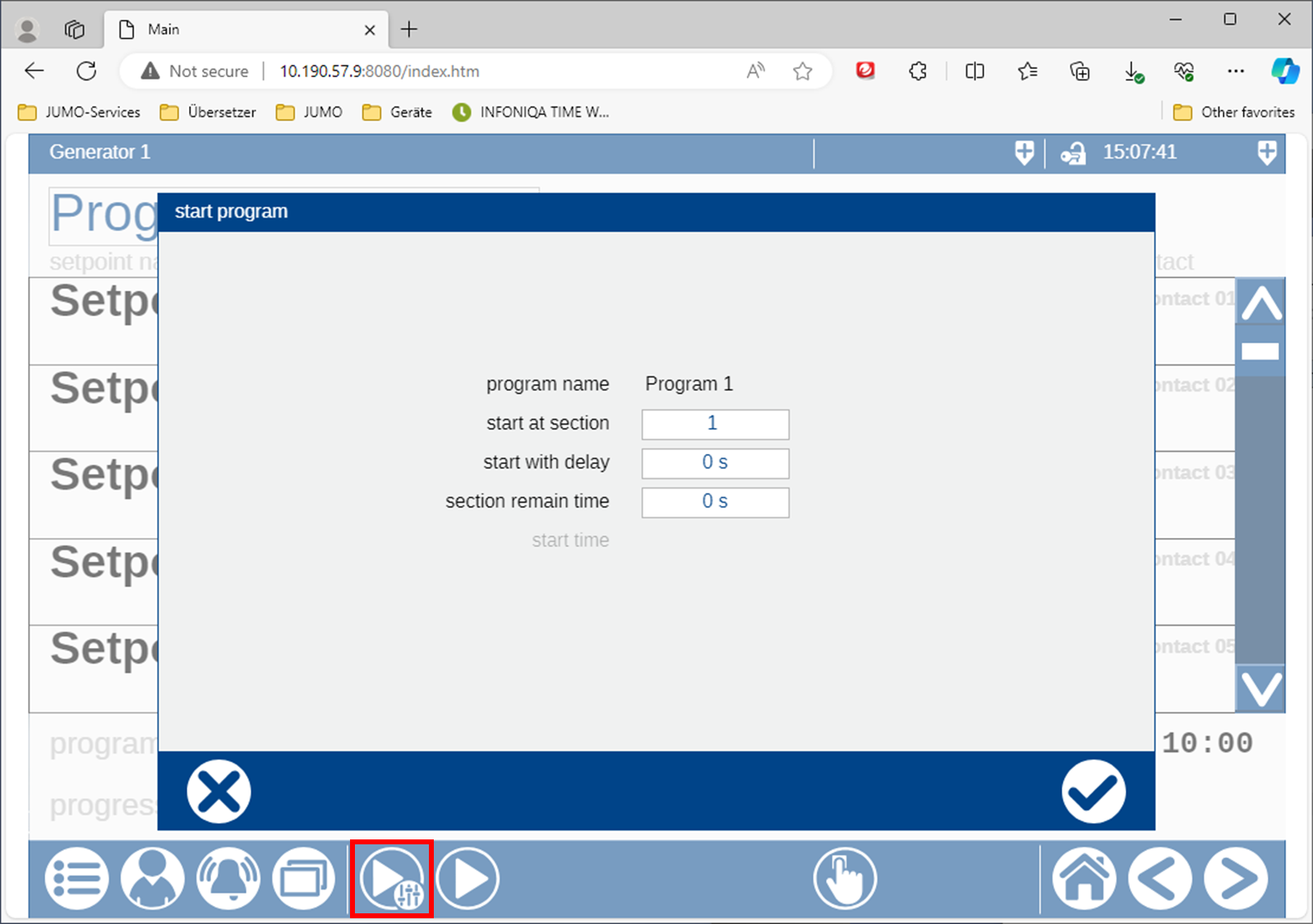 Wird der Button Start mit Parameter gedrückt öffnet sich ein Fenster. Hier kann der Startabschnitt, eine Startverzögerung und die Restabschnittszeit eingegeben werden. Wenn in der Konfiguration Start über Zeit eingestellt wurde, kann man den Programmgeber auch über Datum/Uhrzeit starten.