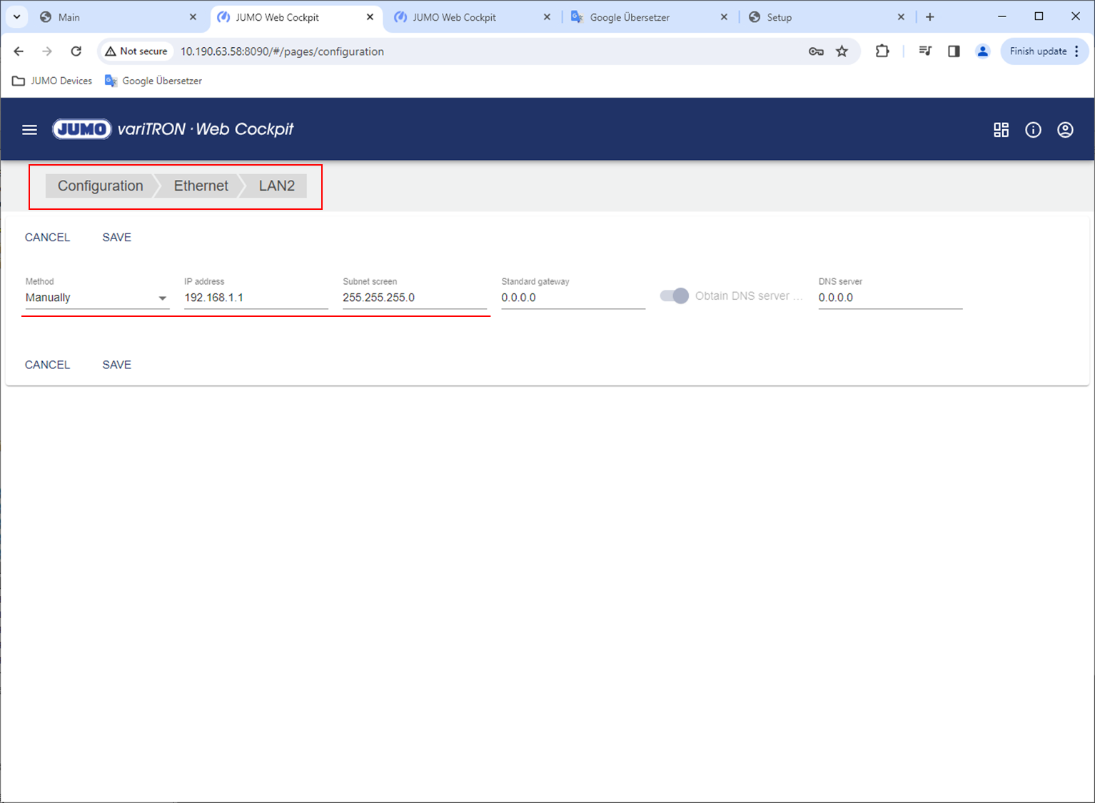 Im Web Cockpit wird nun die LAN2 angepasst.