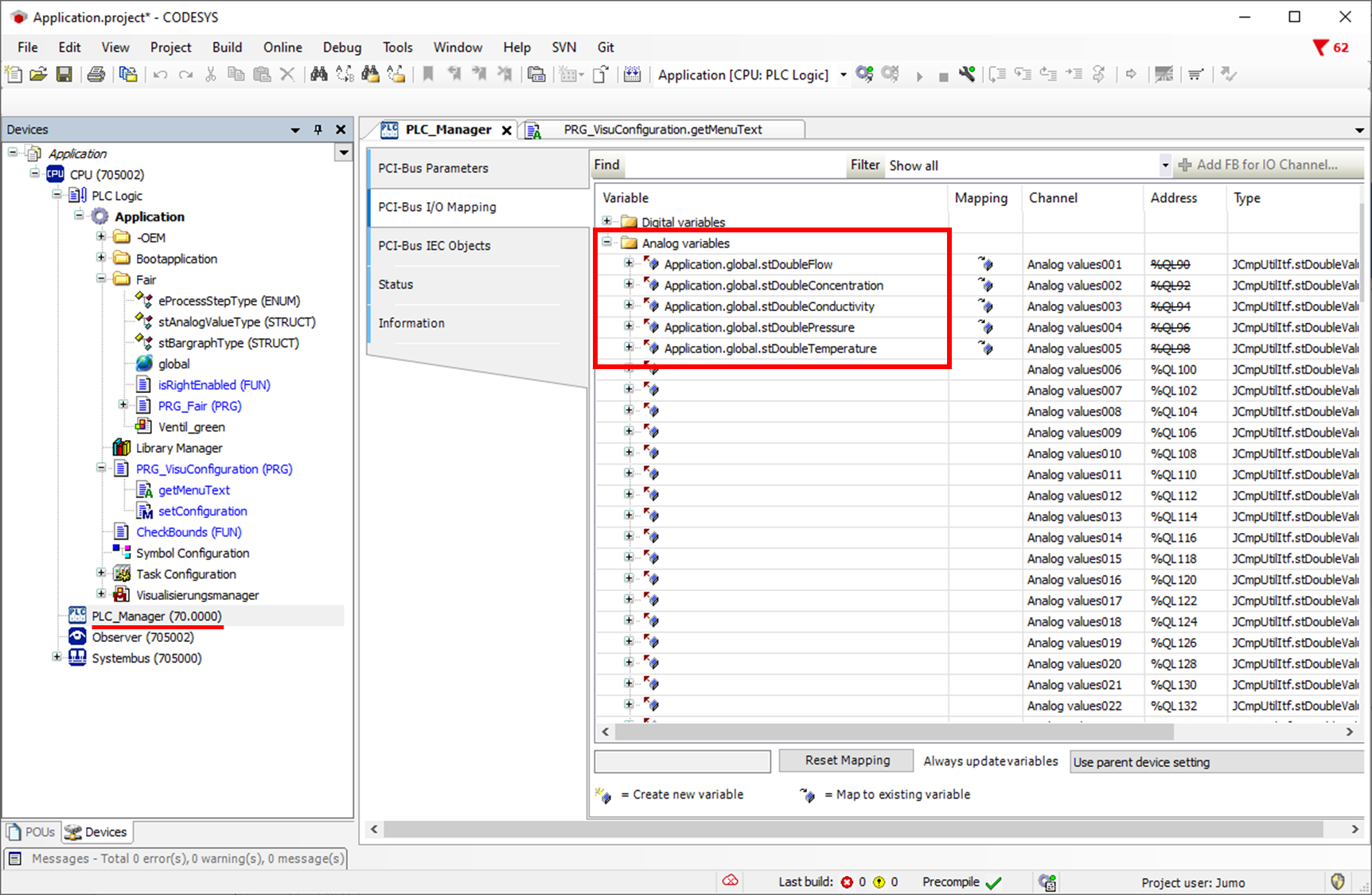 Das folgende Beispiel zeigt, wie Analogwerte den ersten fünf Analog variables im PLC_Manager der CODESYS Applikation zugewiesen werden.
