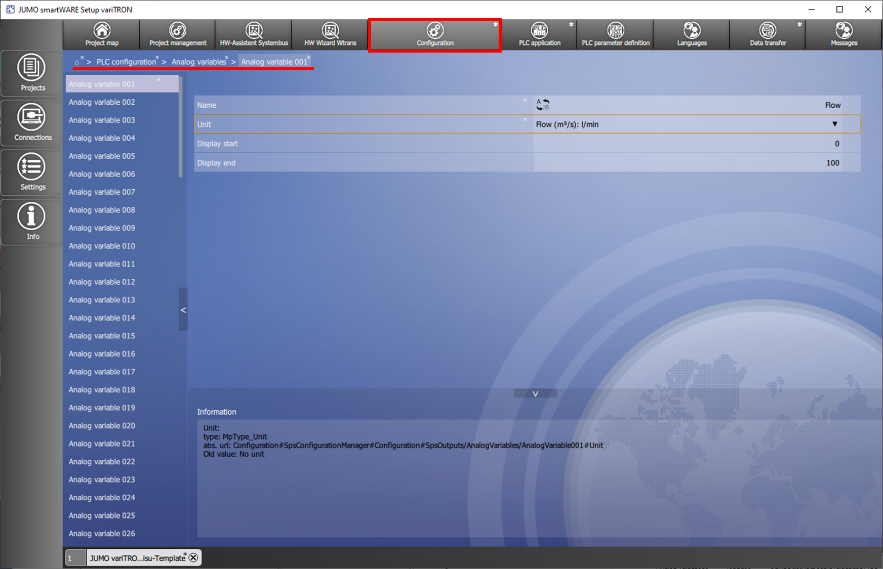 In smartWARE Setup werden im Bereich Configuration unter :Haus: > PLC configuration > Analog variables die analogen Variablen, welche aus der CODESYS übergeben werden, konfiguriert. Für jede Analogvariable kann hier Name (in mehreren Sprachen), Einheit und Anzeigebereich Start und Ende, konfiguriert werden.